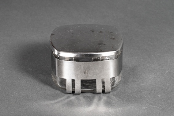 Bezbarwna bombonierka z pokrywą oprawiona w opaskę ze stali nierdzewnej. Wyprodukowana w Fabryce Nakryć Stołowych Stojadła.