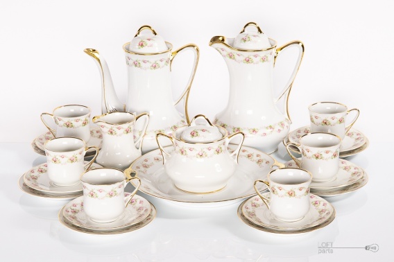 Serwis do kawy wyprodukowany w okresie przedwojennym w fabryce porcelany Carl Tielsch w Wałbrzychu (Altwasser). Serwis składa się z: dwóch dzbanków, sześciu filiżanek ze spodkami, sześciu talerzyków deserowych, patery, cukiernicy i mlecznika.