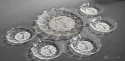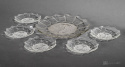 Bezbarwny zestaw deserowy wyprodukowany w Hucie Szkła Gospodarczego Hortensja składający się z patery i pięciu talerzyków.