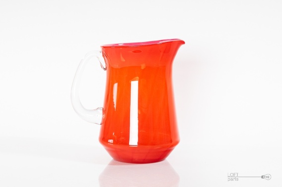 Czerwony z bezbarwnym uchwytem i białym wnętrzem dzbanek zaprojektowany przez Ludwika Fiedorowicza. Wyprodukowany w Hucie Szkła Gospodarczego Ząbkowice.