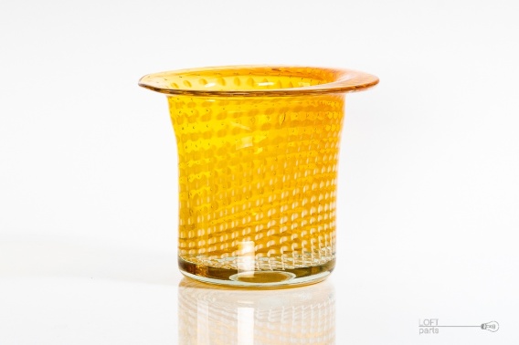 A yellow vase with white decorations produced in the Ząbkowice Household Glass Glassworks. Designed by Jan Sylwester Drost.