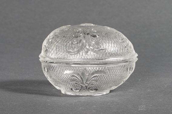Bezbarwne jajo wyprodukowane w Hucie Szkła Gospodarczego Ząbkowice. W katalogu huty nosi numer 42-302/3.