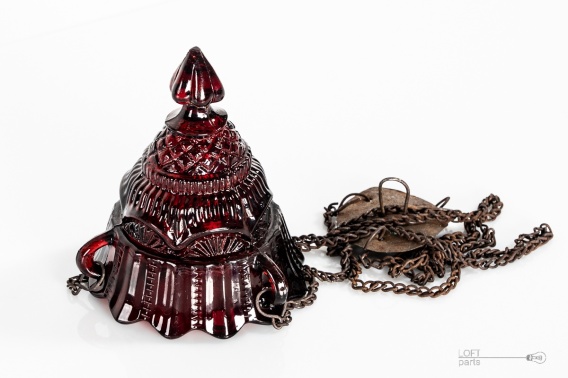 Ruby hanging olive lamp produced in the pre-war period in Ząbkowice Household Glass Glassworks. In the factory catalog, it's called 340. The lamp has a break on the upper edge (see the picture).