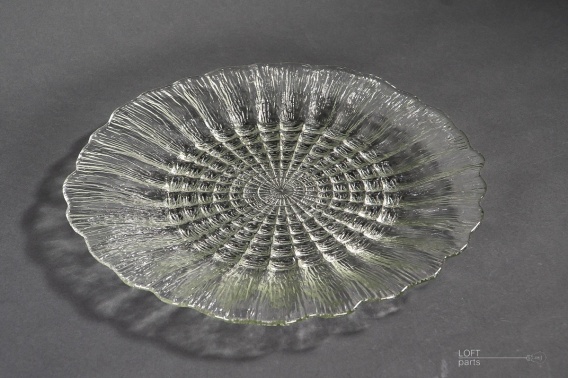 Bezbarwna patera ''Cora'' projektu Eryki Trzewik-Drost. Wyprodukowana w Hucie Szkła Gospodarczego Ząbkowice.