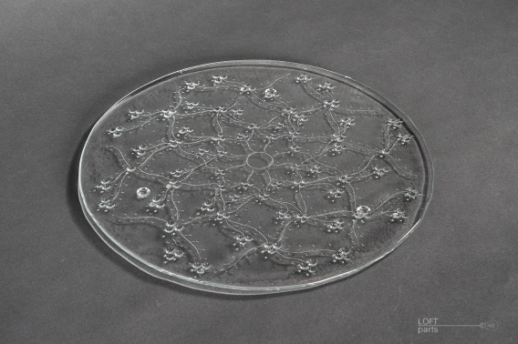 Bezbarwna patera ''Kalina'' wyprodukowana w Hucie Szkła Gospodarczego Ząbkowice. W katalogu huty nosi numer 17-637/0.