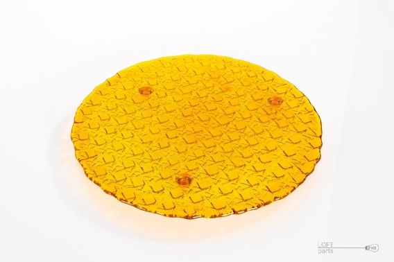 Pomarańczowo-żółta patera ''Kratka'' wyprodukowana w Hucie Szkła Gospodarczego Ząbkowice.