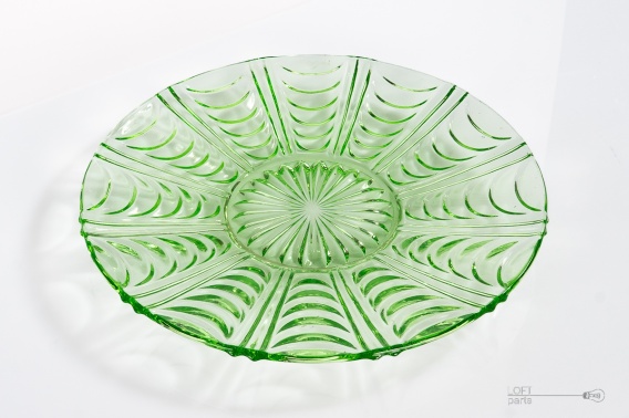 Zielona patera ''Pajęczyna'' wyprodukowana w Hucie Szkła Gospodarczego Ząbkowice.