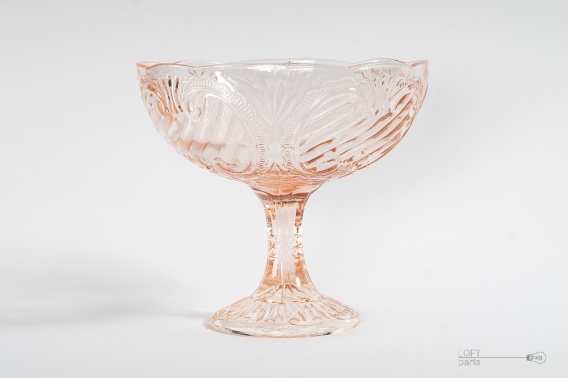 Rozalinowa patera/owocarka ''Zawijasy''. Wyprodukowana w Hucie Szkła Gospodarczego Ząbkowice. W katalogu huty nosi numer 1037.
