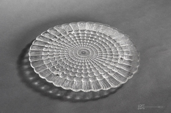 Bezbarwna patera tortownica ''Cora'' wyprodukowana w Hucie Szkła Gospodarczego Ząbkowice. Zaprojektowana przez Erykę Trzewik-Drost.