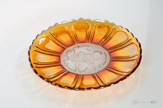 An iridescent platter produced in the Hortensja Glassworks. In the catalogue of the glassworks, it is numbered 36.