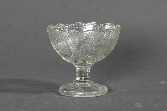 Bezbarwny pucharek ''Medaliony'' wyprodukowany w Hucie Szkła Gospodarczego Ząbkowice.W katalogu huty nosi numer 1180.