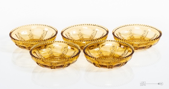 Komplet pięciu miodowych salaterek wyprodukowanych w Hucie Szkła Gospodarczego Ząbkowice. W katalogu huty noszą numer 1210/I.