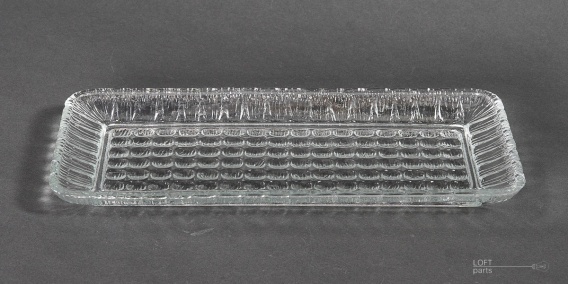 Bezbarwna tacka ''Cora'' wyprodukowana w Hucie Szkła Gospodarczego Ząbkowice. Zaprojektowana przez Erykę Trzewik-Drost.