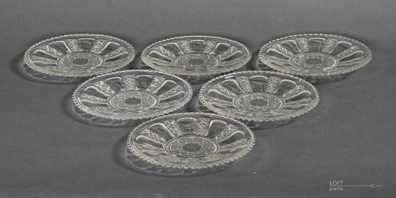 Komplet sześciu bezbarwnych talerzyków wyprodukowanych w Hucie Szkła Gospodarczego Ząbkowice. W katalogu huty noszą numer 1210/I.