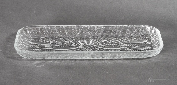 Bezbarwna tacka ''Jeż morski'' zaprojektowana przez Erykę Trzewik-Drost. Wyprodukowana w Hucie Szkła Gospodarczego Ząbkowice.