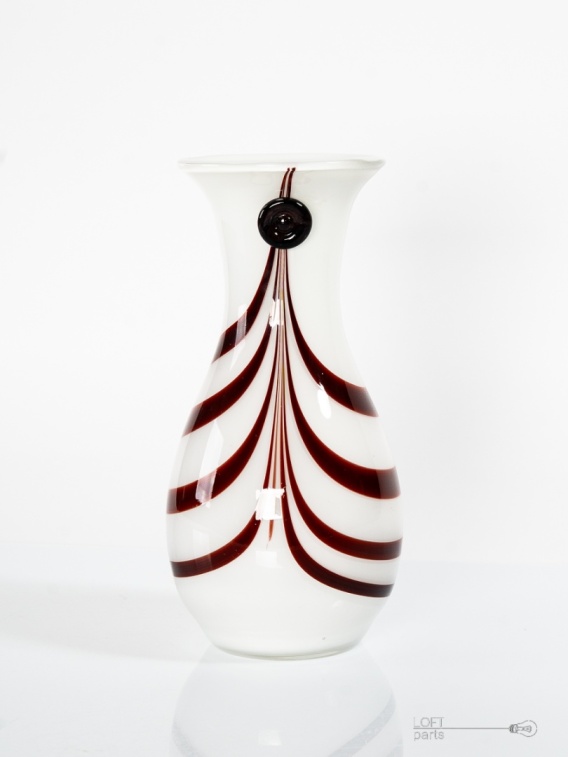 Biały z czarnymi guzikami wazon zaprojektowany przez Ludwika Fiedorowicza. Wyprodukowany w Hucie Szkła Gospodarczego Ząbkowice.