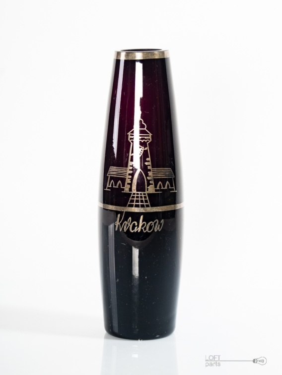 Fioletowy, pamiątkowy wazon z Krakowa wyprodukowany w Hucie Szkła Gospodarczego Hortensja. Wazon otoczony metalowym zdobieniem wykonanym w technice silver overlay.