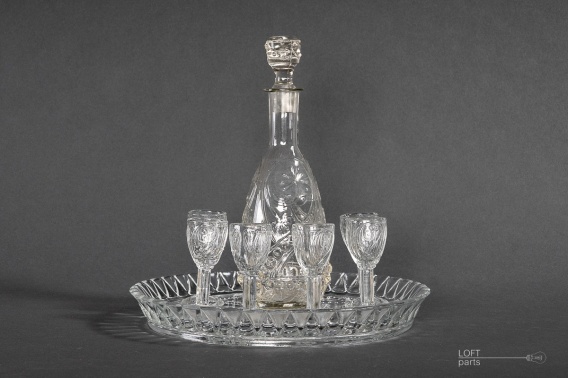 Bezbarwny zestaw do wódki składający się z: tacki, karafki oraz sześciu kieliszków wyprodukowany w Hucie Szkła Gospodarczego Hortensja.