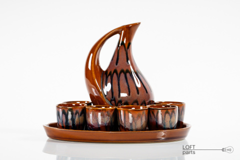 Stoneware set for serving spirits. It consists of a carafe, six glasses and a tray.