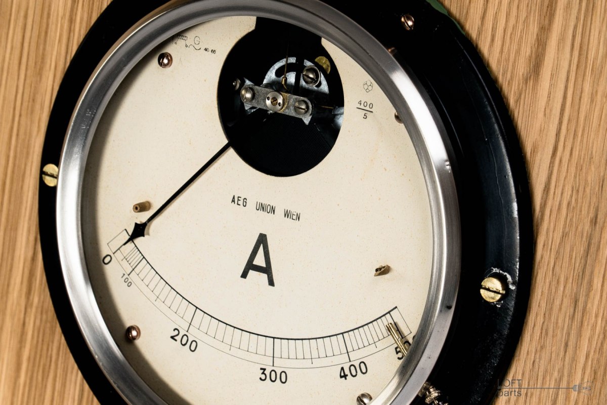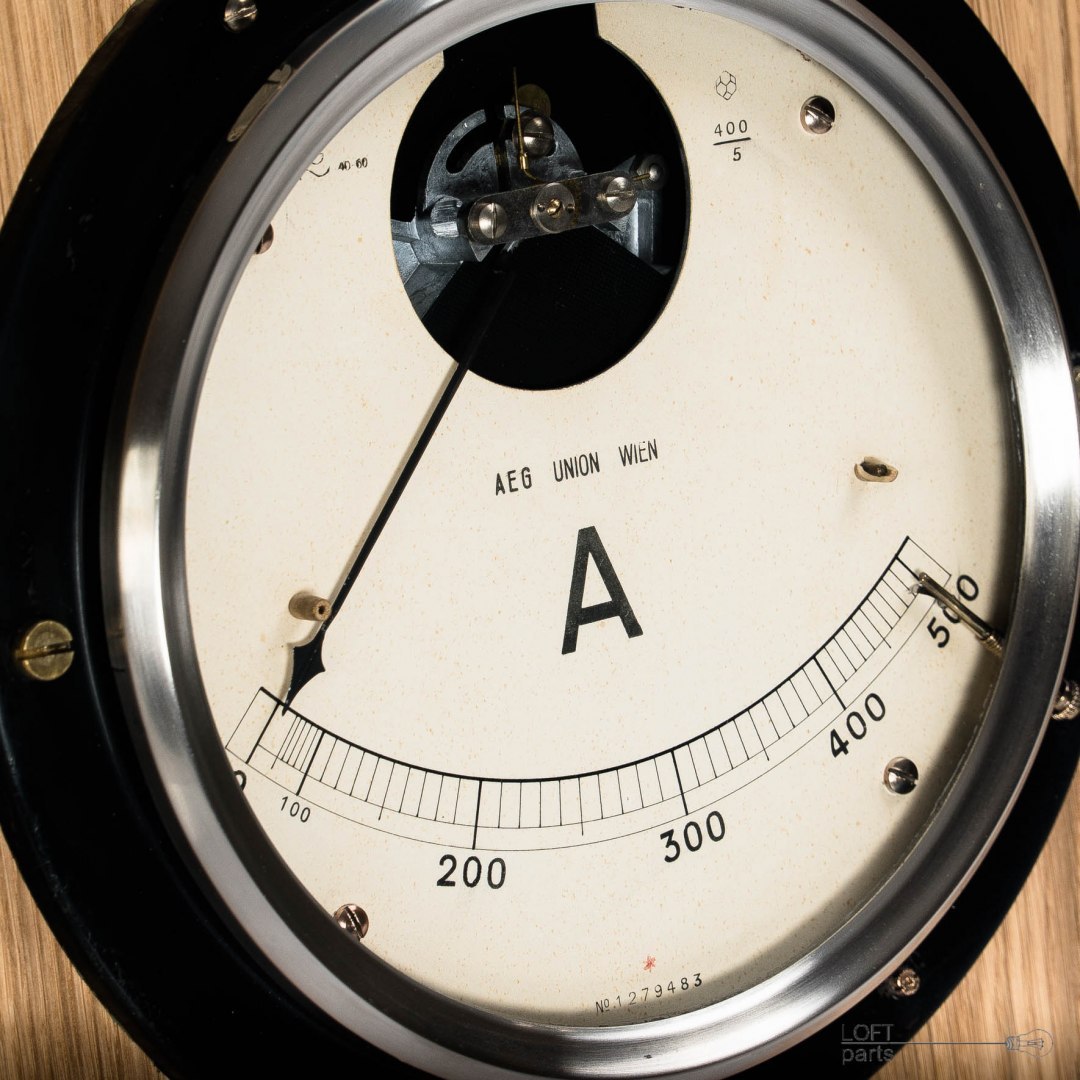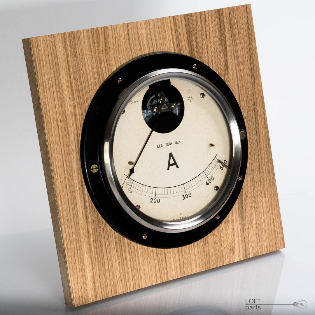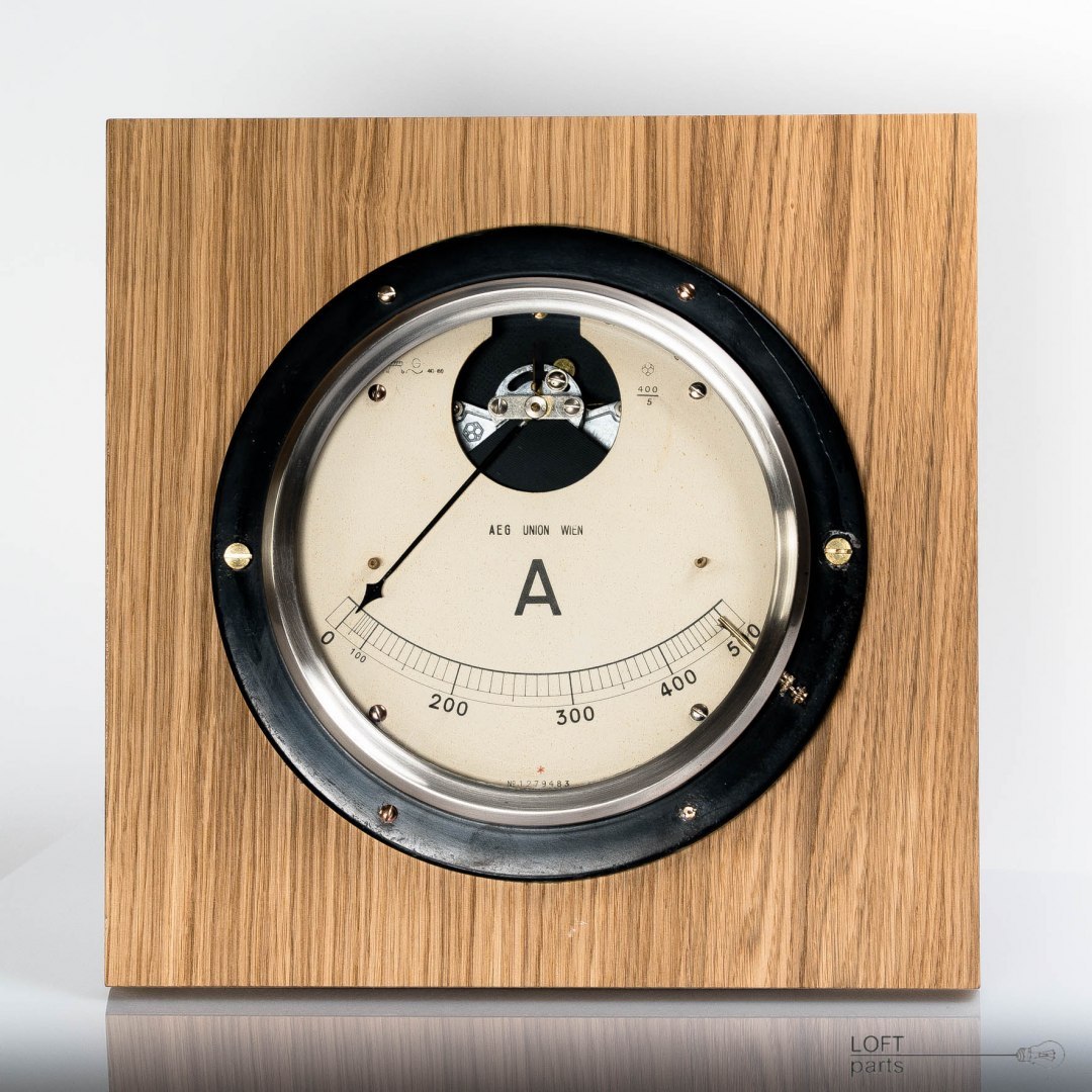 AEG Union Wien 500 A AC ammeter. Produced in the thirties of the last century. Preserved in its original condition, cleaned and framed in plaques with natural oak veneer. The whole thing can be hung on the wall and add charm to an industrial interior.