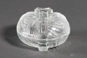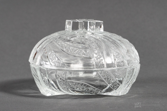 Bezbarwna bombonierka w stylu Art Deco wyprodukowana w Hucie Szkła Gospodarczego Hortensja.