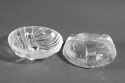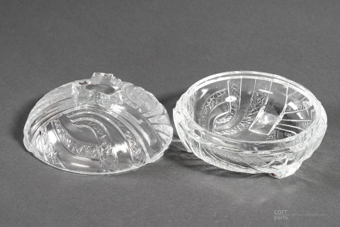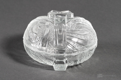 Bezbarwna bombonierka w stylu Art Deco wyprodukowana w Hucie Szkła Gospodarczego Hortensja. W katalogu huty nosi numer 478.