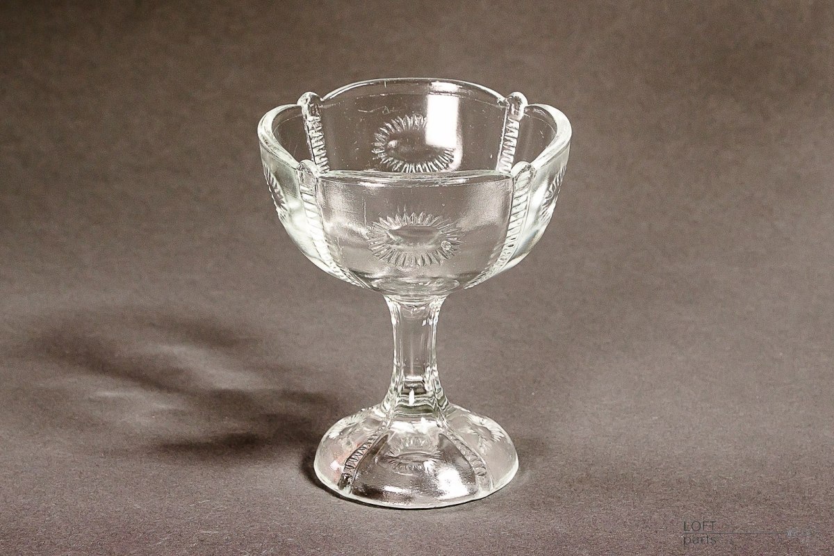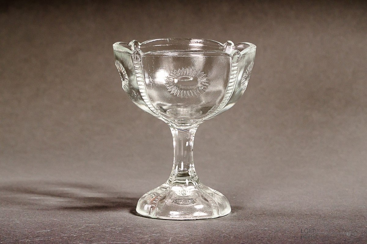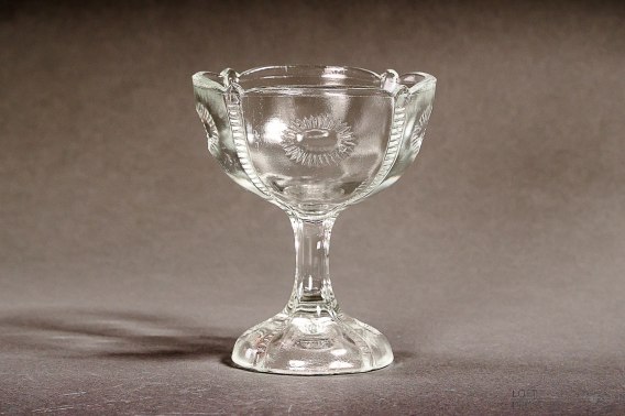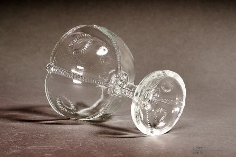 Bezbarwna bombonierka wyprodukowana w Hucie Szkła Gospodarczego Ząbkowice. W katalogu huty nosi numer 1176/I.
