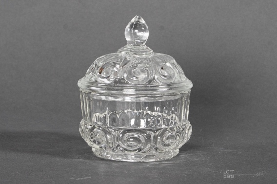 Bezbarwna bombonierka wyprodukowana w Hucie Szkła Gospodarczego Ząbkowice. W katalogu huty nosi numer 420.
