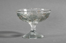 Czerwona  z żółtą stopą bombonierka zaprojektowana przez Ludwika Fiedorowicza wyprodukowana w Hucie Szkła Gospodarczego Ząbkowice. Bombonierka ma drobne uszczerbienia na górnej krawędzi.