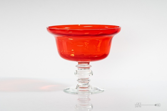 A red chocolate bowl designed by Ludwik Fiedorowicz and produced in the Ząbkowice Glassworks.