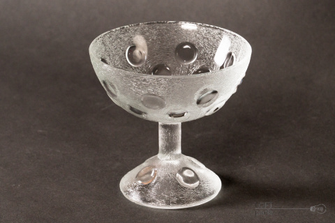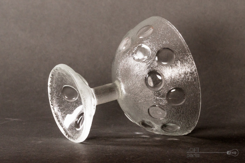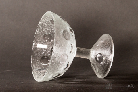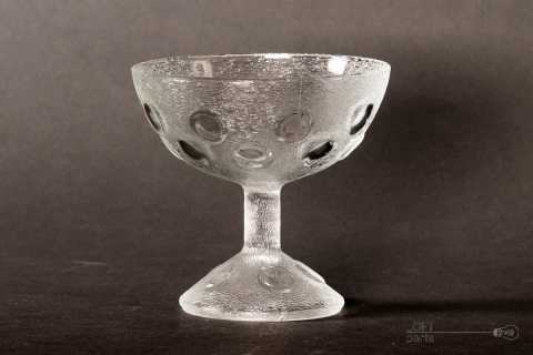 Bezbarwna bombonierka ''Oculus''. Wyprodukowana w Hucie Szkła Gospodarczego Ząbkowice. W katalogach huty nosi numer 22-608/13.