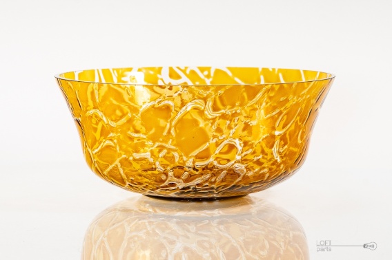 Miodowa misa  zaprojektowana przez Janusza Kazaneckiego. Wyprodukowana w Hucie Szkła Gospodarczego Hortensja.