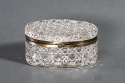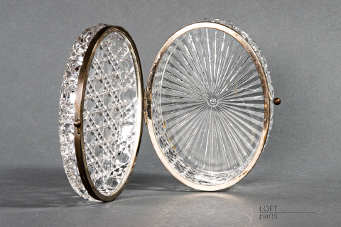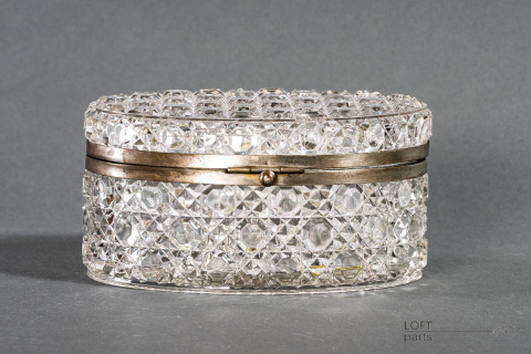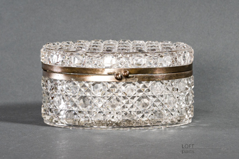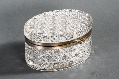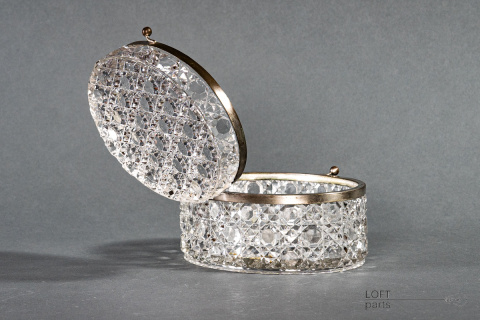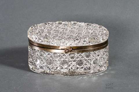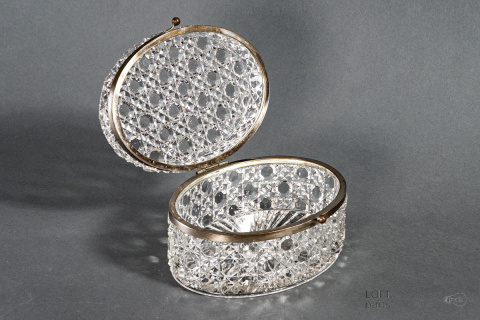 Bezbarwna szkatułka/herbatnica z okuciami. Sygnowana znakiem B.