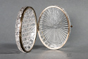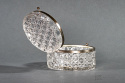 Bezbarwna szkatułka/herbatnica z okuciami. Sygnowana znakiem B. Niestety nie udało mi się zidentyfikować pochodzenia. Zapięcie jest kompletne ale wymaga regulacji.