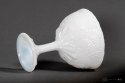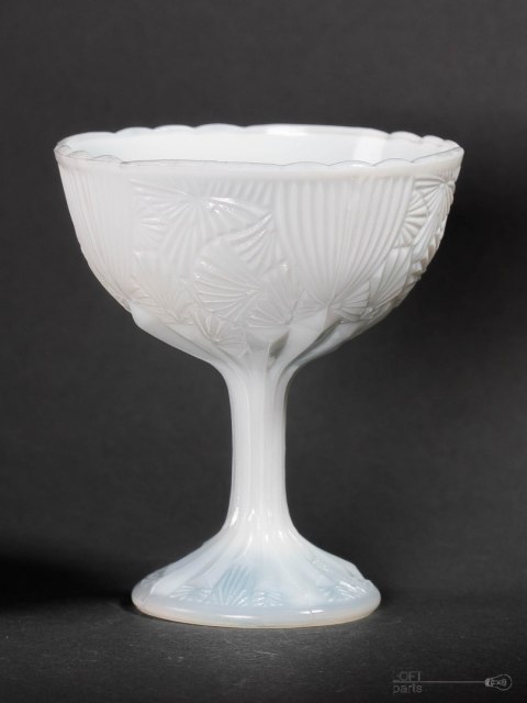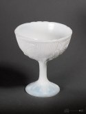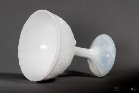 Chocolate bowl "Fans" made of lattimo glass, produced in the Ząbkowice Household Glass Glassworks.. In the catalogue of the glassworks it bears the number 1178. The foot of the chocolate box is slightly translucent.