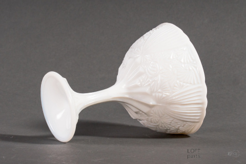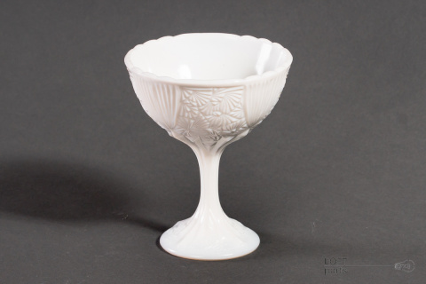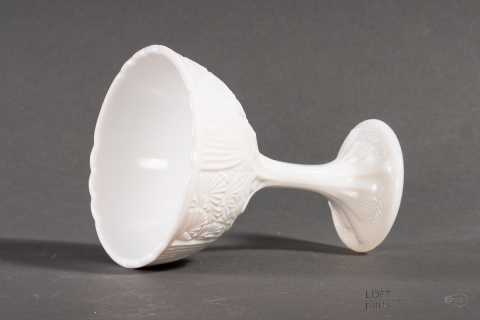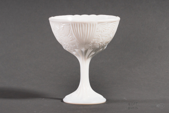 Chocolate bowl "Fans" made of lattimo glass produced in the Ząbkowice Household Glass Glassworks. In the catalogues of the glassworks it bears the number 1178.