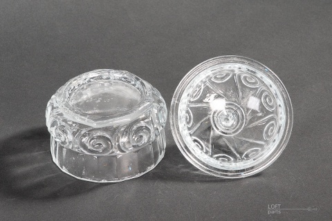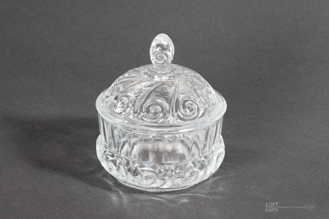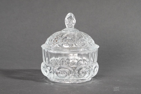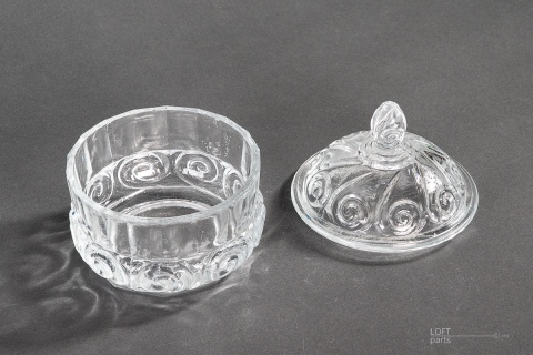 A colourless chocolate box produced in the Ząbkowice Household Glass Glassworks. In the catalogue of the glassworks, it bears the number 420.