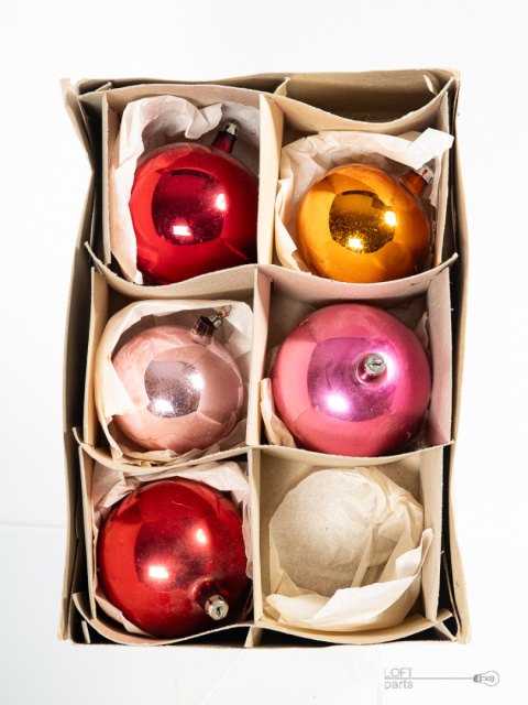 Komplet pięciu bombek choinkowych wyprodukowanych w Zakładach Produkcyjno-Usługowych we Wrocławiu.