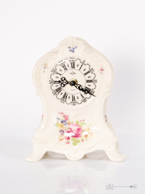 Zegar kominkowy wyprodukowany przez Fabrykę Wodomierzy i Zegarów Metron w Toruniu. Obudowa zegara wyprodukowana przez Porcelanę Chodzież.