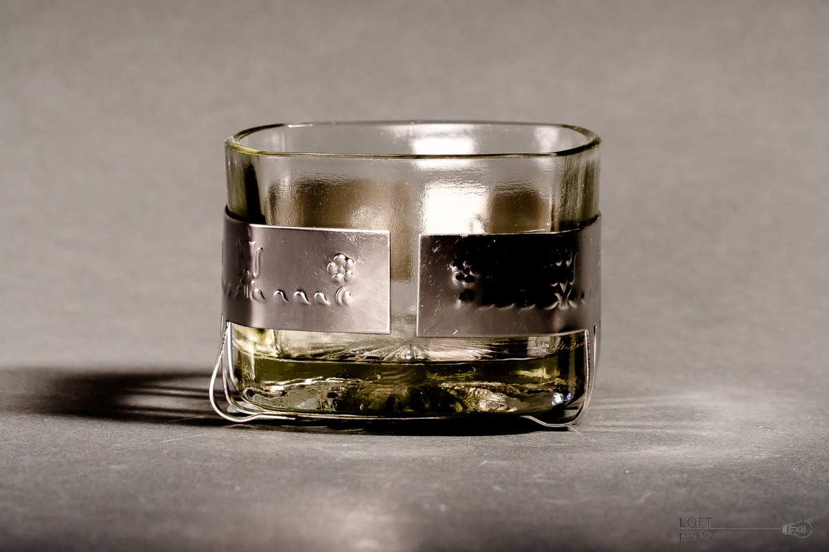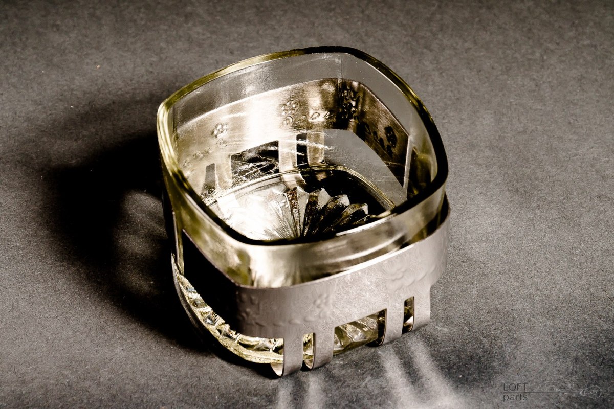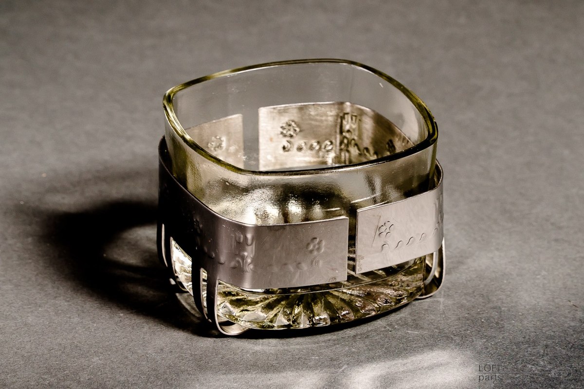 Bezbarwna cukiernica oprawiona w opaskę ze stali nierdzewnej. Wyprodukowana w Fabryce Nakryć Stołowych Stojadła.