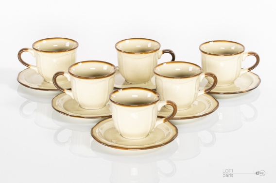 Komplet sześciu filiżanek ze spodkami ''Nostalgia'' wyprodukowany w Zakładach Porcelitu Stołowego Pruszków.