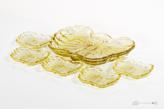 Yellow dessert set "Butterfly" consisting of a platter and four plates produced in the Ząbkowice Glassworks.