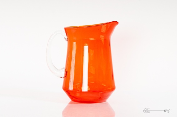 A red jug with a colourless handle designed by Ludwik Fiedorowicz. Produced in the Ząbkowice Household Glass Factory. Antico glass.
