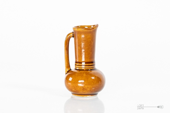 Miniaturowy brązowy dzbanek wyprodukowany w Spółdzielni Pracy Rękodzieła Artystycznego w Bolesławcu.