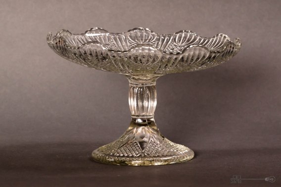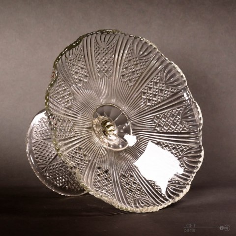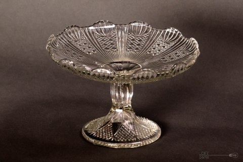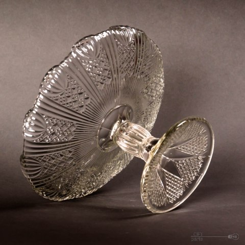 Bezbarwna patera/owocarkawyprodukowana w Hucie Szkła Gospodarczego Ząbkowice. W katalogu huty nosi numer 320.