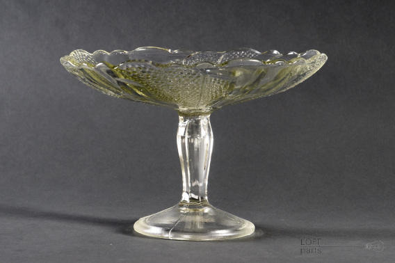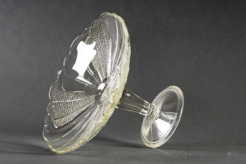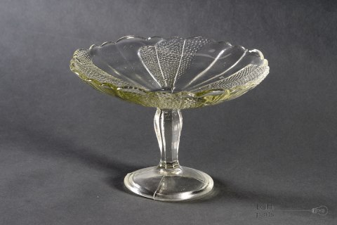 A colourless fruit stand produced in Krosno Glassworks. In the catalogue of the glassworks it bears the number 394.