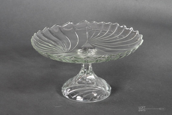 Bezbarwna patera/owocarka w stylu Art Deco wyprodukowana w Krośnieńskich Hutach Szkła. W katalogu huty nosi numer 400.