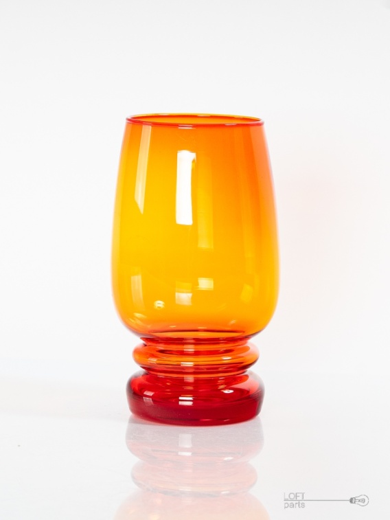 Pomarańczowo-czerwona szklanka ''Verona'' zaprojektowana przez Ludwika Fiedorowicza. Wyprodukowana w Hucie Szkła Gospodarczego Ząbkowice.