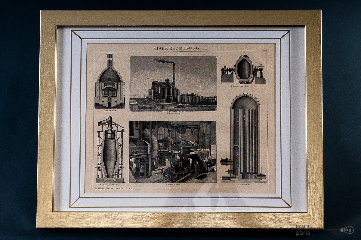 Grafika ''Produkcja żelaza''. Dokument oryginalny, oprawiony w złotą ramkę. Przedstawia rysunki obrazujące produkcję żelaza. Bardzo dobrze prezentuje się na ceglanych i betonowych ścianach a tematyka wprost nawiązuje do industrialnego wzornictwa. Grafika posiada certyfikat (pieczęć) niemieckiego antykwariatu.