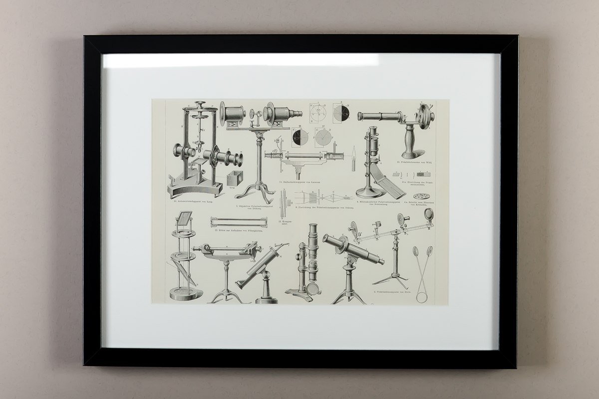 Graphic ''Optical Instruments''. Original document, bound in a black frame. It presents drawings of various types of optical instruments (microscopes, optical benches, polarizers, etc.) It looks very good on brick and concrete walls, and the subject matter directly refers to industrial design.